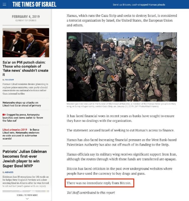 The story in question was Hamas; the militant Palestinian group, asking for donations in Bitcoin to continue its offensive against Israel. The paper even goes as far as repeating tired rhetoric of Bitcoin’s use in procuring illegal items.