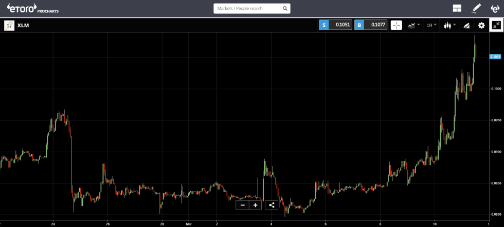 Over the weekend it was Stellar’s turn for double-digit gains. From Friday morning until the time of this writing it hit a total rise of 23%.