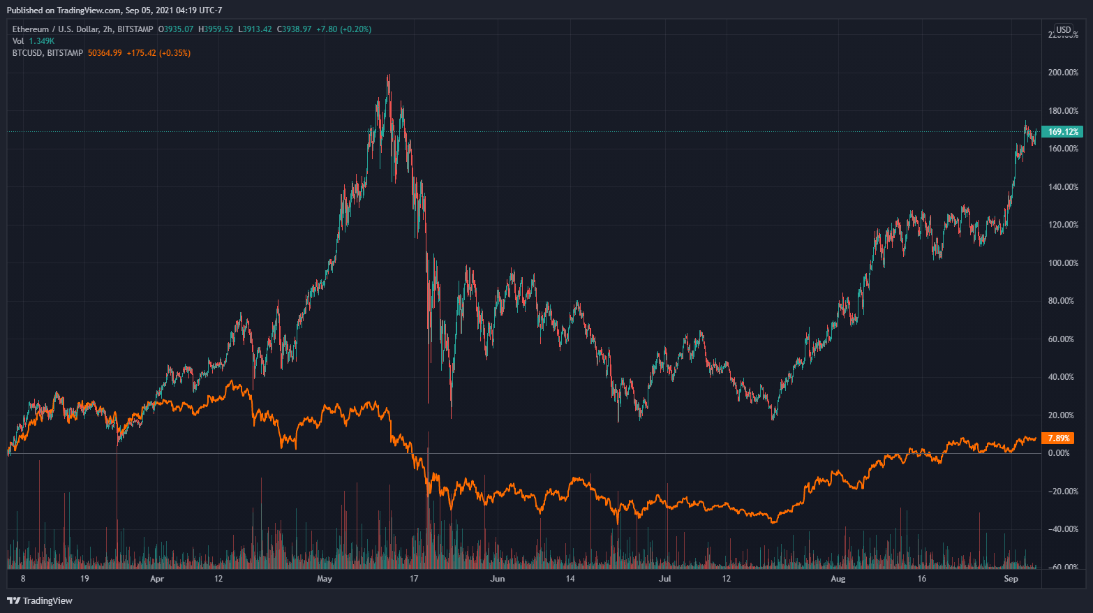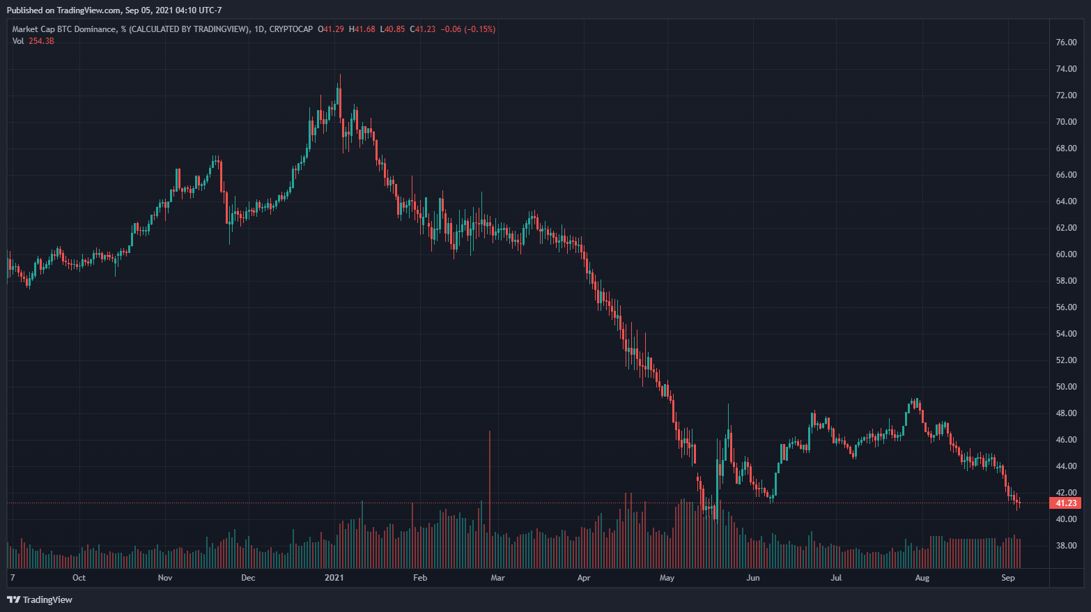 Bitcoin’s dominance has also continued to slip. As Ethereum and other coins such as Cardano, Ripple, and Binance Coin surged higher, BTC’s total market share in market capitalization dipped to 41.23% — down from 73.78% at the beginning of the year.