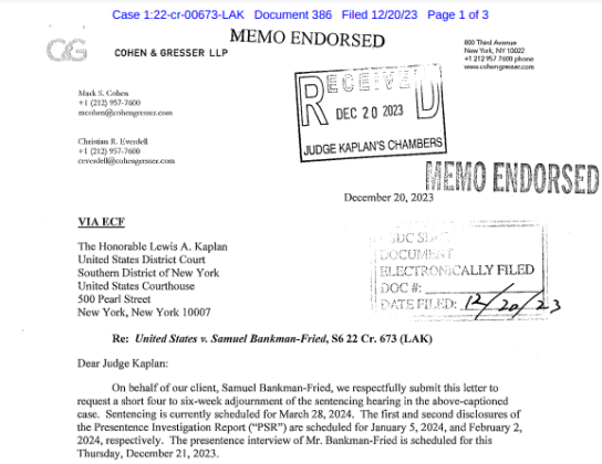 Letter requesting adjournment in Bankman-Fried's sentencing. Source: Court Listener