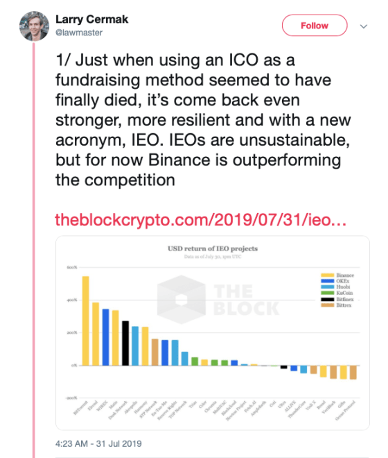 On Wednesday blockchain and cryptocurrency researcher, Larry Cermak posted an intriguing Twitter thread about the performance of IEOs in 2019.
