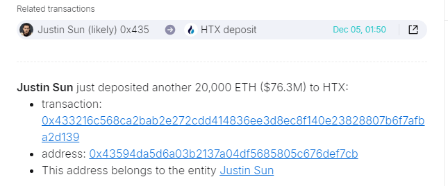 The crypto entrepreneur also added 20,000 ETH to HTX last December 5th. This transaction, valued at $76.3 million, was the second-largest crypto move past $3,800.
