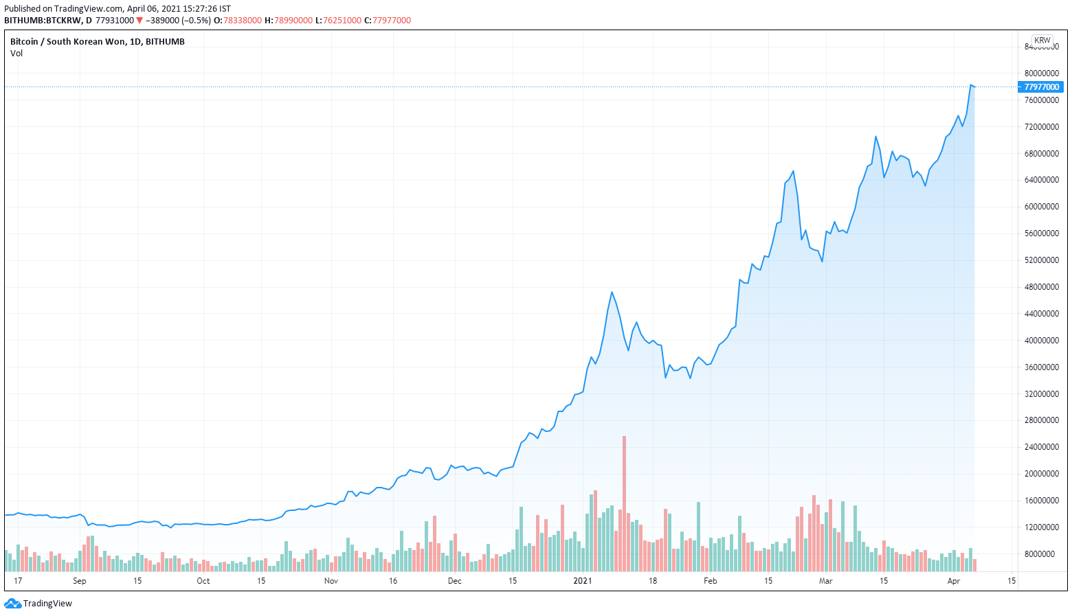 In South Korea, however, the resurgence of the local crypto scene and tightening regulations have led Bitcoin prices to surge to 77,661,000 won, or 69,300 dollars on Bithumb. Bitcoin’s current all-time high is $61,500 — which is nearly 12% less than current prices in South Korea. If you were to buy Bitcoin from Bithumb at current prices, you would have to pay $11,000 more per coin. Why is this?