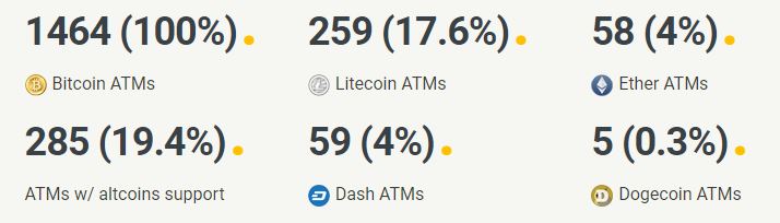 According to Bitcoin ATM Radar, there are currently 1,464 Bitcoin ATMs spread across the globe. North America claims the great portion (74%), with 201 located in Canada itself (the US stands in first with 974). However, there are currently only 259 Litecoin ATMs worldwide, and a paltry 58 Ethereum ATMs in total.