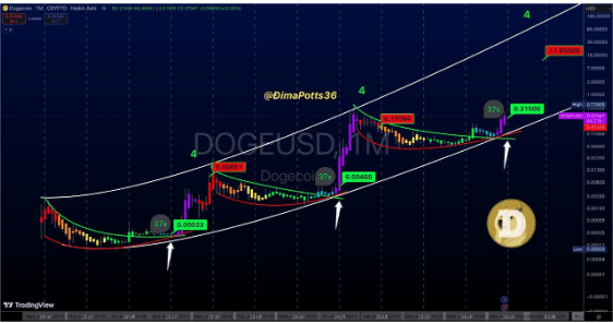 In an X post, crypto analyst Dima James predicted that the Dogecoin price would rally to $11 in 2025. This came as he analyzed Dogecoin’s monthly chart with a focus on the meme coin’s fourth year in each cycle. The analyst noted that in the first cycle, DOGE’s year four started at $0.00023 and ended at $0.000851, representing a 37 times price increase.