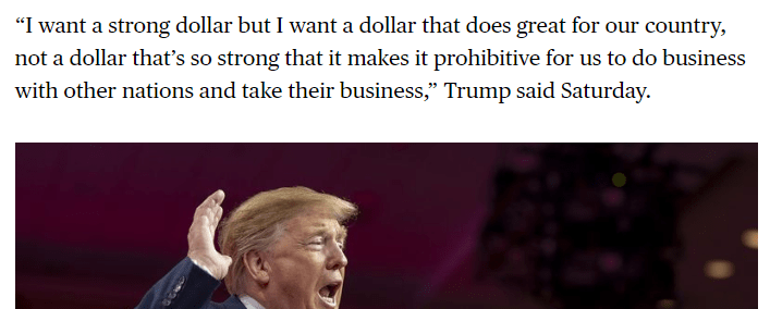 Ever since his election, Donald Trump has done his best to put downward verbal pressure on the US Dollar. But his statements at a Maryland conference were a bit more confusing than usual.