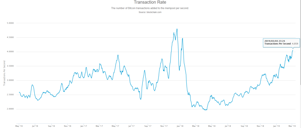 Volumes have subsided somewhat from the late February excitement and volatility remains subdued. Transactions on the world’s favorite blockchain however, have seen yet another significant uptick as Bitcoin now processes an average of 4.05 transactions per second.