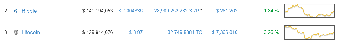 Onto other coins, it seems that Ripple has solidified its spot in number two, overtaking Litecoin. If Litecoin continues to stay like this, it might even fall to number four or number 5 territory.