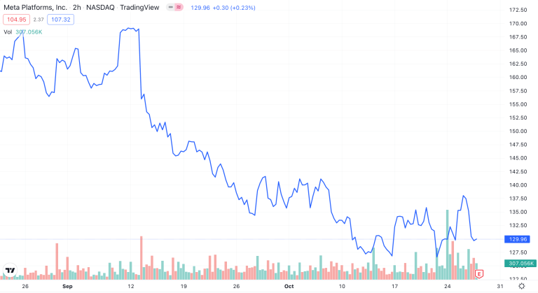Meta is facing major headwinds with expenditures towards it's VR, AR, and broader metaverse division. | Source: NASDAQ:META on TradingView.com