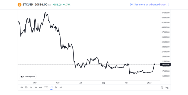BTC trading at $20,886 | Source: BTCUSD Chart on Tradingview.com.