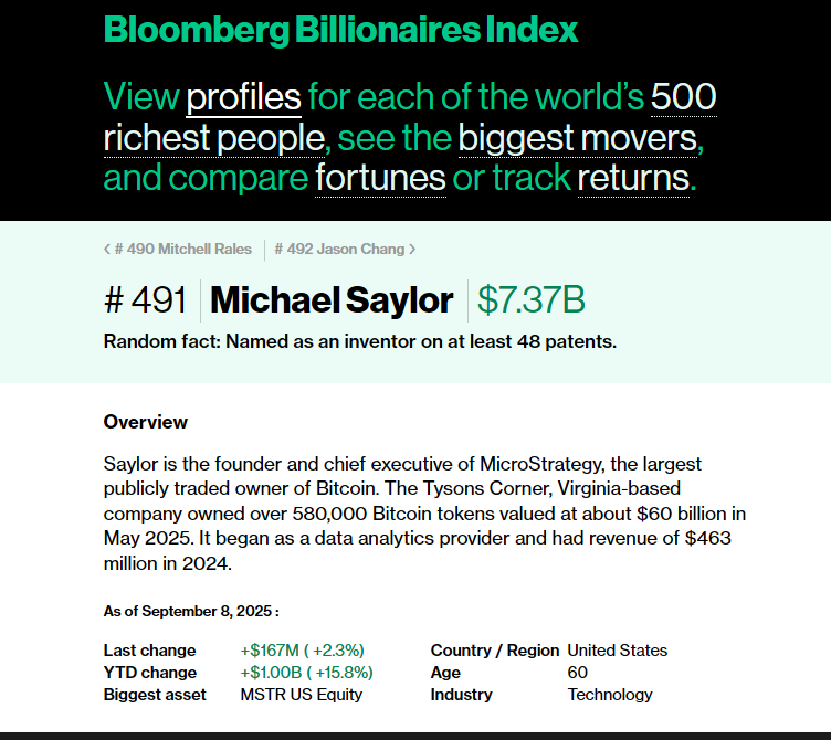 Bloomberg’s live index shows short-term swings in Saylor’s number: his net worth rose by about $167 million in a single recent update, underscoring how quickly the headline figure can change when Strategy shares or Bitcoin move.