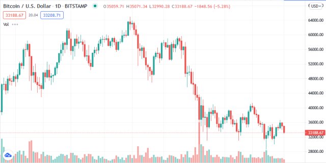 Right now, BTC is trading at about $33k, down 3% in the past 7 days. Here is a chart showing the trend in its price: