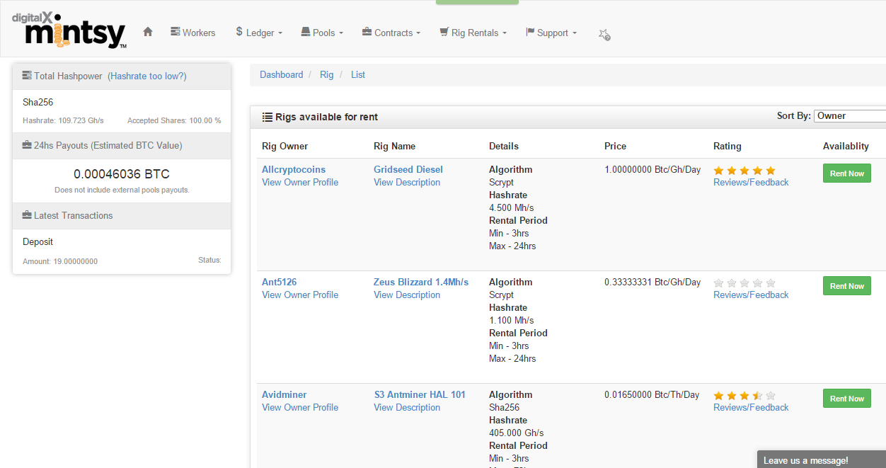Another feature is that you can point your physical miners to Minsty’s pools as well. We pointed a BFL Jalapeno at 20 gh/s and a BFL Single at 55 gh/s to Minsty and after a few mins they showed up on the dashboard. One of the interesting features is you can also rent out your hash power pointed to Mintsy giving you more options for mining income. Depressed Bitcoin value has left many cloud mining companies with issues being able to run. Long with his direct relationships in the mining industry has been able to address the issues of miner costs and electricity costs.