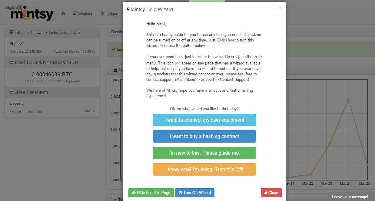 When you first log into Mintsy, you will see they have a very detailed wizard that helps guide you through your options. The menus are simple and easy to access. Mintsy provides contracts for Scrypt Mining and SHA-256/Bitcoin Mining. Thier contracts are different than many on the market as they provide fixed term contracts. There is no lifetime option. Mintsy sells the contracts in 3 months and 6-month lengths that include all costs up front, so any payments you make go directly to you. This change makes it more expensive at the outset, but you do not pay fees for electricity and maintenance.