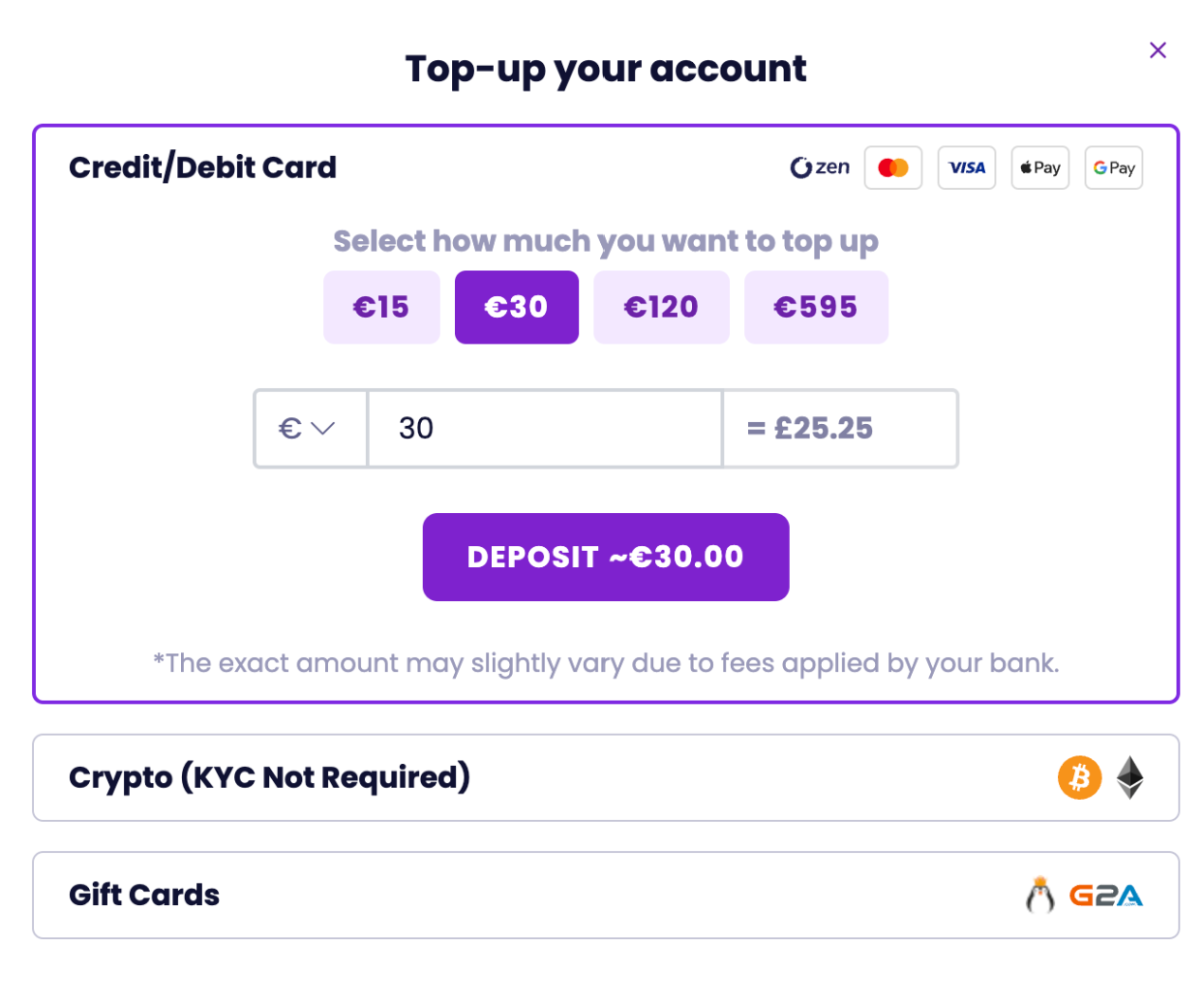 След това се внася баланс, често чрез кредитна карта, PayPal или дори криптовалути.