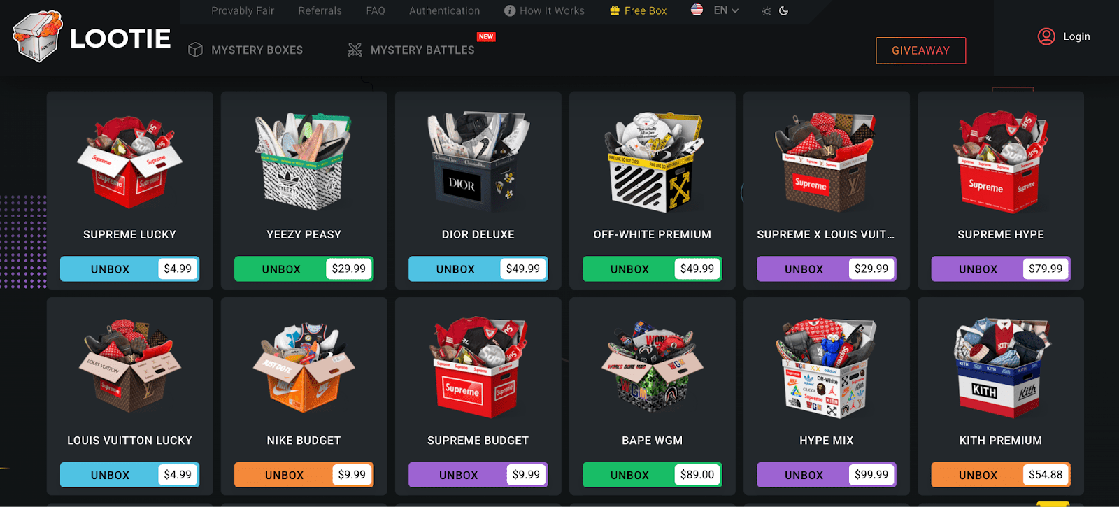Lootie е създала име основно в областта на луксозната мода. Ако сте почитатели на висококачествена улична мода и дизайнерски марки, тук ще намерите собствени кутии за марки като Louis Vuitton, Supreme или Gucci. Още от около 5 щатски долара можете да отворите кутии, които обещават понякога скъпи артикули – от маратонки на стойност четирицифрени суми до елегантни чанти. Има и чисто стотинкови кутии, които струват едва долар и въпреки това могат да съдържат изненади като iPhone или Nike Air Force.