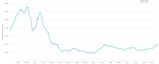 In this graph, we can see that the on-chain activity is indeed increasing lately and has now topped 2.5 transactions per second for the first time since February.