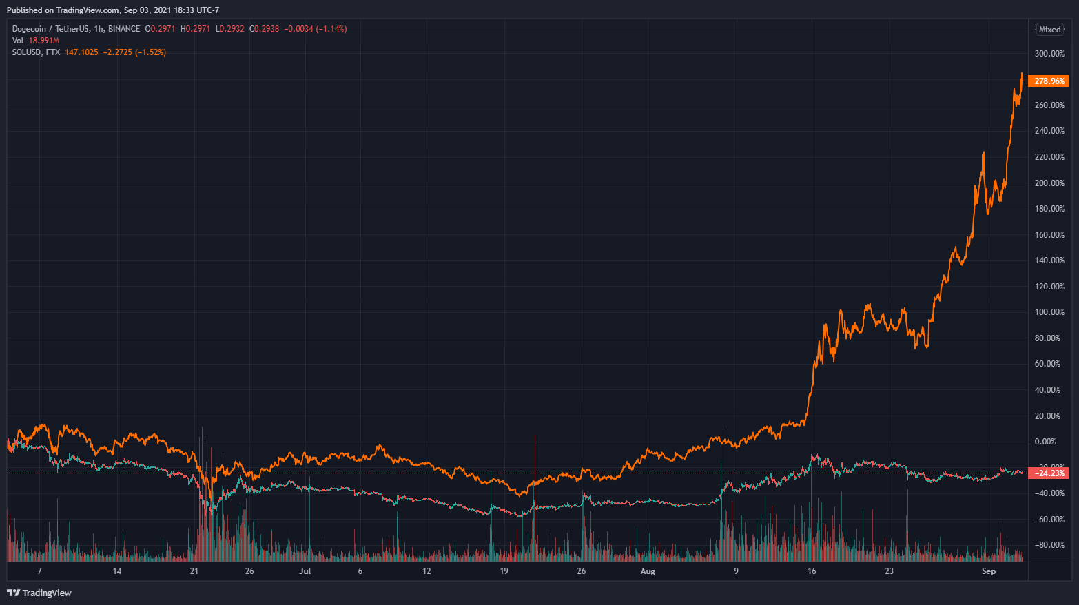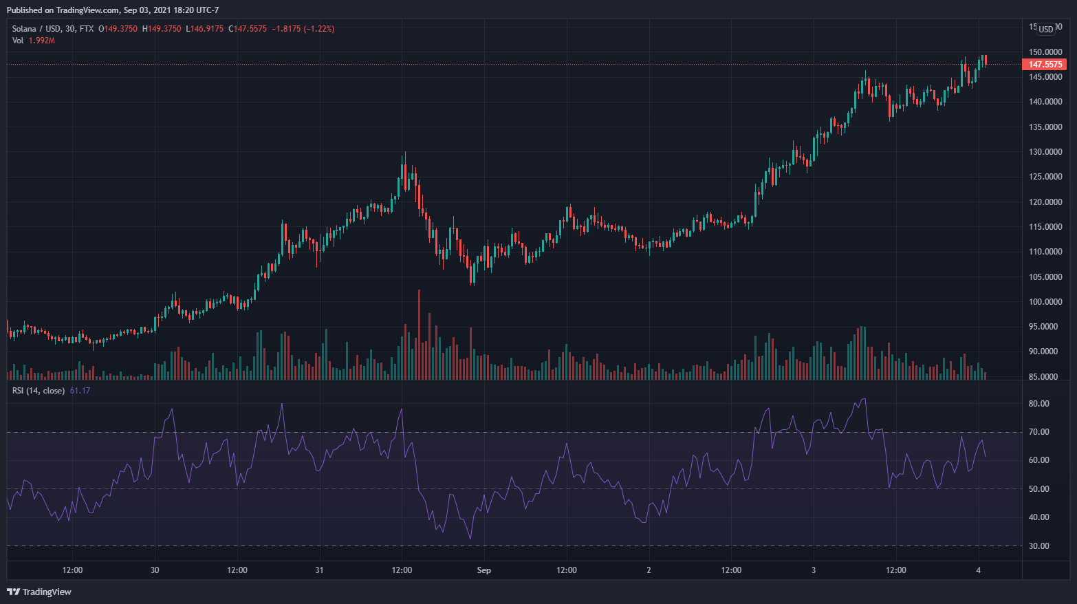Driven by the recent NFT and DeFi craze, Solana’s SOL set its all-time high earlier today. According to CoinMarketCap, the cryptocurrency is up 12.62% and 70.86% in the past 24 hours and the past week, respectively.