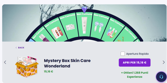 La mistery box Dyson VS Ghd ha un prezzo di € 35,73 e i premi a sorpresa si possono ottenere girando una ruota fortunata. Tentando la sorte per questa scatola contenente prodotti di cosmetica, si ottengono 2.990 punti esperienza.