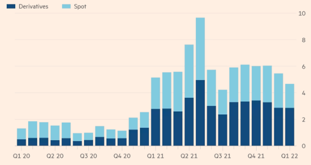 Similarly, with the ongoing and increasing adoption of blockchain technology, derivatives trading in cryptocurrencies is starting to become increasingly popular. Based on a report by Tokeninsight’s Cryptocurrency Derivatives Exchange, the cryptocurrency derivatives market’s trading volume grew exponentially between Q3 2019 and Q2 2020 with a total increase of 159.4%. This peaked in May 2021, just before the Chinese mining ban which healed the start of the current bear market. A rebound thereafter brought it somewhat back towards its May 2021 high, although it has seemingly plateaued since.