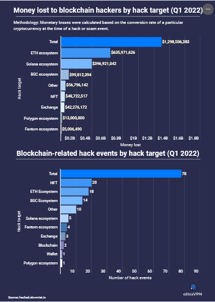 According to the Atlas VPN team’s new research, blockchain hackers stole approximately $1.3 billion in 78 hack events in the first quarter of 2022. Furthermore, hacks on the Ethereum and Solana ecosystems resulted in over $1 billion in losses in this quarter alone.