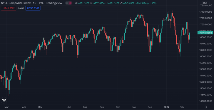 The New York Stock Exchange's flagship composite index, NYA, has had a strong performance over the past year. | Source: NYSE: NYA on TradingView.com