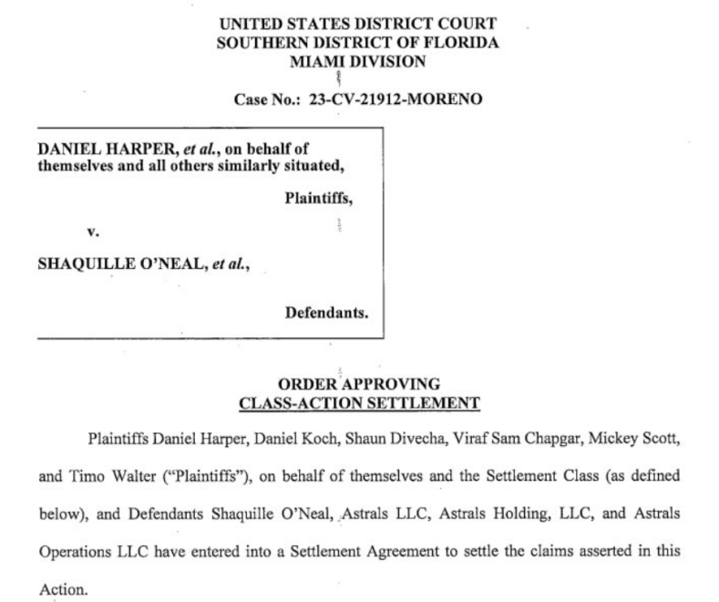 Screenshot of court document on Shaq's legal settlement. Source: Courtlistener