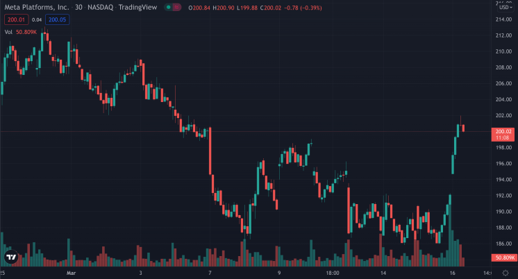Facebook (Meta) and it's subsidiary platform Instagram are looking to integrate NFT support in the near-term. Can the adoption help right the ship to keep Instagram aggressively positioning amongst competitors? | Source: NASDAQ: FB on TradingView.com