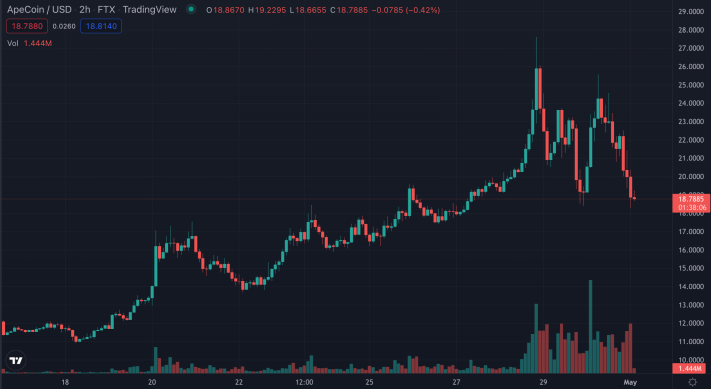 ApeCoin was utilized in today's The Otherside metaverse real estate release from Yuga Labs and BAYC, and now OpenSea is accepting APE as well. It's been a volatile ride for APE holders - a vintage crypto experience. | Source: APE-USD on TradingView.com