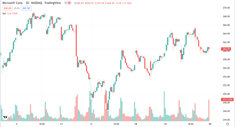 Microsoft, the parent company of Majong - the original creators of Minecraft - is seemingly aligning with an anti-NFT perspective, while competitors such as Epic Games remain open to having developers make their individual decisions on the matter. | Source: NASDAQ: MSFT on TradingView.com