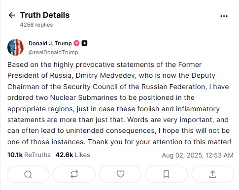 Based on reports, US President Donald Trump ordered two US nuclear submarines to new positions after former Russian President Dmitry Medvedev dismissed Trump’s 10-day demand to end the Ukraine conflict.