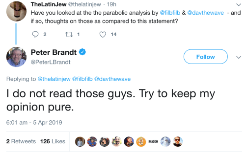 In the comments of his tweet, someone asked if Brandt had seen the parabolic analysis of Bitcoinist’s own market analyst filbfilb. However, he replied that he preferred to keep his opinion pure.