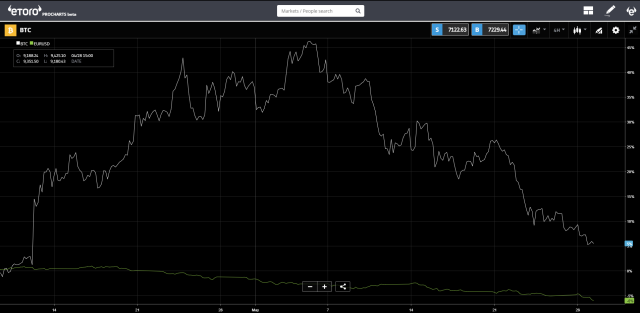 Here is a chart of bitcoin and the Euro since April 9th. As you can see, the Euro has been in a rather stable and steady decline since then, while, erratic as it’s been, bitcoin is still up.
