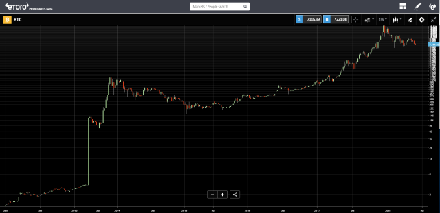 We can see this quite clearly by just glancing at bitcoin’s long-term chart in logarithmic format. The price is up from $1 a coin in 2012 to more than $7,000 today, and while it does have the potential to fall back to zero, it could also see another meteoric surge at any time.