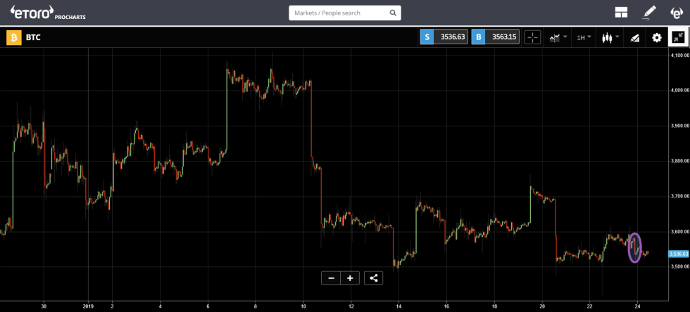 The price of Bitcoin did decline slightly at the time of the news (purple circle) but is still holding well at the $3,500 support level.