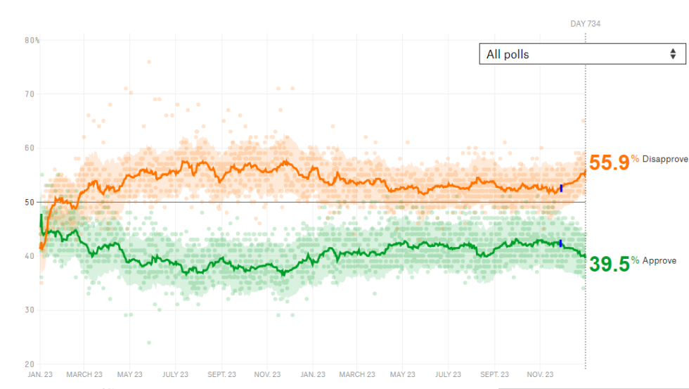 The US government shutdown has now dragged the President’s approval below 40%. This graph from fivethirtyeight.com shows Trump’s rating since the inauguration. The blue dots show when the shutdown began.