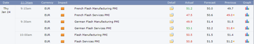 A string of data has hit the Euro today. The PMI is an index that measures how companies are feeling about the economy by surveying purchasing managers in the services and manufacturing sectors.