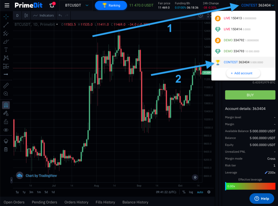From the PrimeBit WebTrader, switch to your contest demo account and make your trades there. To do this, just click on the Accounts menu (1), then choose “Contest” from the dropdown list (2).