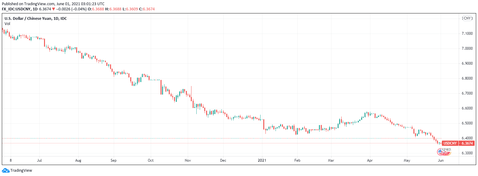 The dollar (USD) continues to weaken against the Yuan (CNY) as both economies begin to recover from the pandemic. Source: Tradingview.com