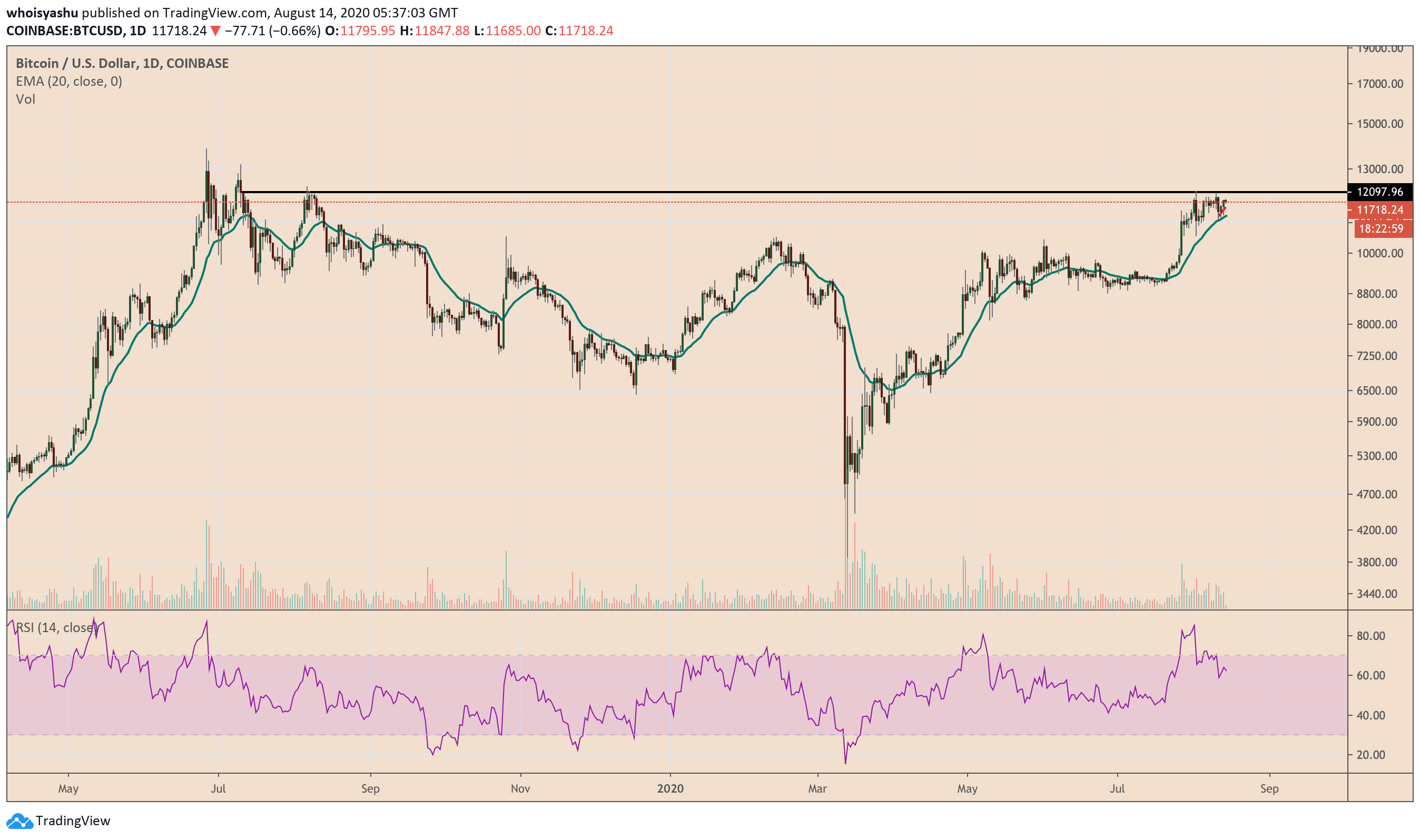 Bitcoin was trading near $11,750 at the time of this writing. It was attempting to close above $12,000 to establish a short-term bullish bias.