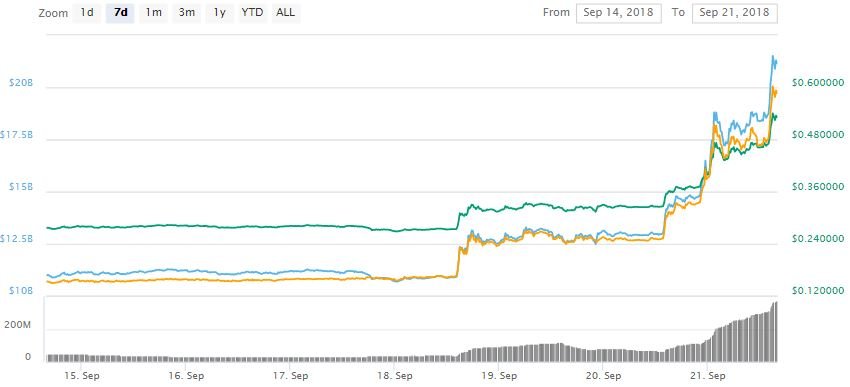 A sea of green could be observed through the entire cryptocurrency market as it gained upwards of $20 billion overnight. Ripple (XRP) is amid the forerunners of today’s rally, marking an increase of more than 45 percent for the day.
