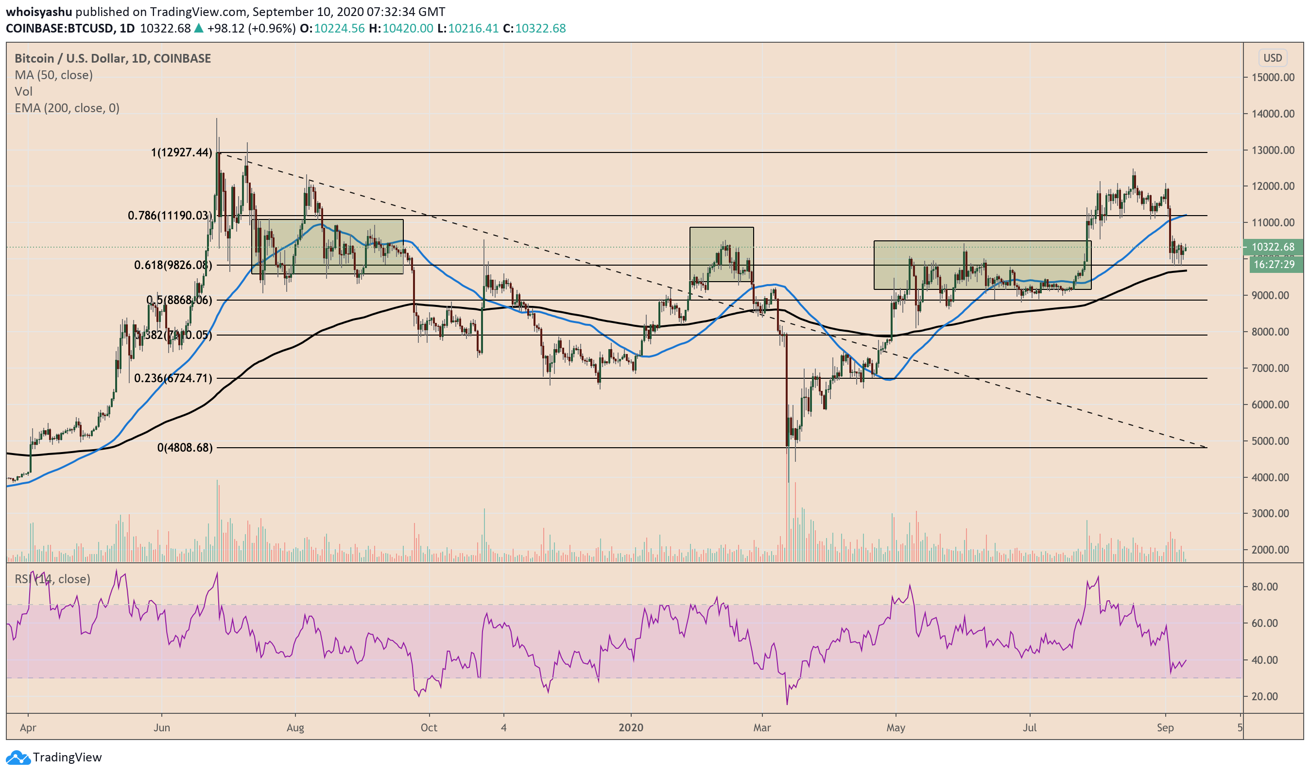 There is no record of $9,800-10,000 that shows it as an area of sharp rebound. It has–though–served as a range that confirms breakout/breakdown moves. That said, if bears can close the price below it, then they could easily take BTC/USD towards the next Fib support level sitting at $8,869.