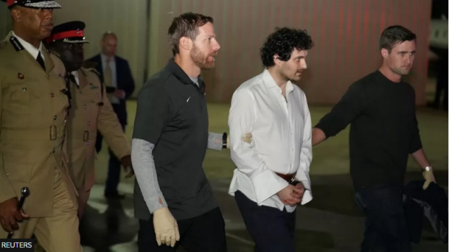 FTX founder Sam Bankman-Fried led in handcuffs to the plane. Image: Reuters/BBC.