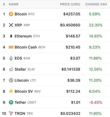 Each of the top cryptocurrencies saw significant gains, with XRP [coin_price coin=ripple] being the biggest mover over 20%. Notable gains were seen across the board, with six of the top ten coins making double-digit gains and tether falling as people ditched the USD equivalent for the soaring cryptocurrencies.