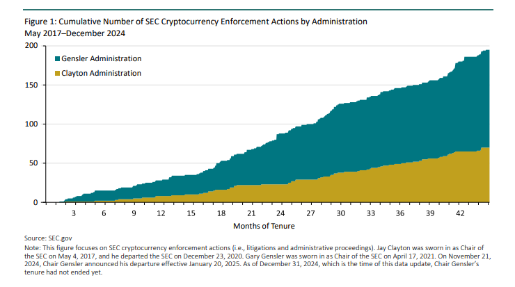 Between the Gensler and Clayton administrations, there is a stark contrast in their approaches to cryptocurrency regulation. Gensler oversaw 125 enforcement actions in just over three years, whereas Clayton initiated only 70 during a comparable timeframe.