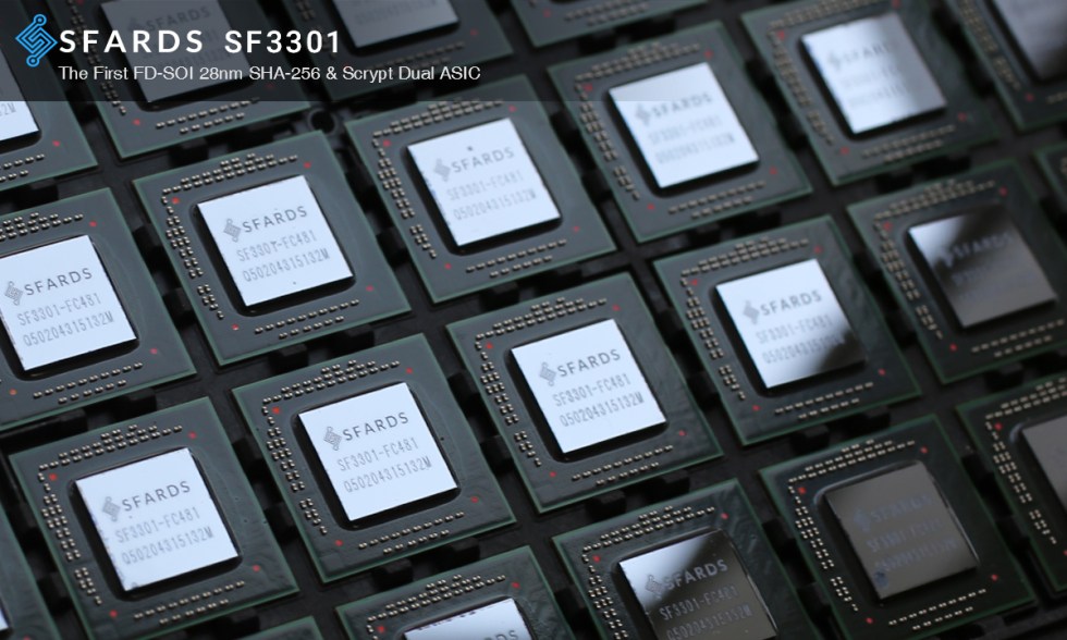 Completely New Technology, Optimum Power Efficiency SFARDS’ SF3301 fully utilizes the advantages of the FD-SOI technology. This brings increased forward body bias; the chip is operational at lower voltage while maintaining a higher frequency. The chip boasts impressive power efficiency while affording high hash power, allowing for much lower wastage per hash. The ASIC’s lowest working voltage is 0.45V, with lowest BTC efficiency at 0.19J/GH, and lowest LTC efficiency at 1.75J/MH. In current market conditions compared to other mining technology, dual-algorithm capabilities can provide a clear advantage. Under recent testing conditions, the single SF3301 chip reached BTC hash power levels of 152GH/s, and LTC levels of 3.17MH/s. The SF3301’s high integration level leads to future miners being smaller; power wastage being less and even more powerful miners. There is room for movement in these areas and as such different customer requests can be fulfilled.