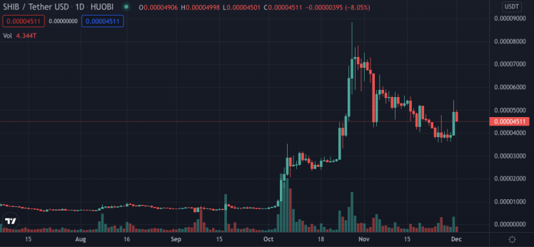The meme coin that made it’s big push throughout this year has now gained a 28.2% rise in 24 hours to stand at 0.00005022 by around 7AM ET, according to Trading View. Shiba Inu started in August 2020 as a copycat coin to meme token dogecoin. The meme cryptocurrency has grown about 80,000 times in value this year. This played a substantial role in moving many investors’ needles, and made Shiba a hot coin in 2021.