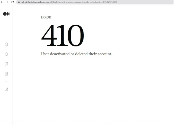 The pseudonymous founder has removed all Shiba Inu-related blogs, including the original version of “All Hail the Shiba.” All four SHIB blogs have been removed from the Medium platform, and the page now displays the following message: “410. User deactivated or deleted their account.”