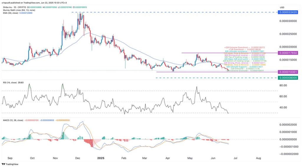อย่างไรก็ตาม ในกราฟรายวัน ราคา Shiba Inu กำลังค่อยๆ สร้างรูปแบบกราฟที่เรียกว่า “Double-Bottom” ซึ่งเป็นสัญญาณกระทิง โดยมีแนวรับสำคัญอยู่ที่ $0.00001030 หากราคาสามารถยืนเหนือแนวรับนี้ได้ มีโอกาสที่จะดีดตัวกลับขึ้นไปทดสอบแนวต้าน (Neckline) ที่ $0.00001765 ซึ่งคิดเป็นการฟื้นตัวกว่า 62% จากระดับปัจจุบัน แต่หากราคาหลุดแนวรับดังกล่าว อาจเป็นการส่งสัญญาณขาลงต่อไปยังเป้าหมายที่ $0.0000080