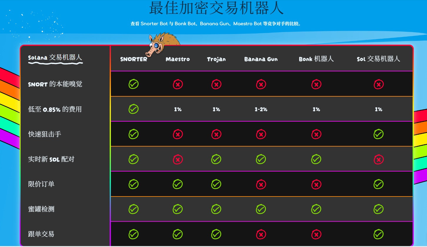 Snorter不僅是發現潛力Meme Coin的工具,其原生代幣SNORT本身就是一個具備真實效用的Meme Coin混合體。目前預售已突破250萬美元的SNORT代幣,正在構建一個強大的Telegram交易機器人生態: